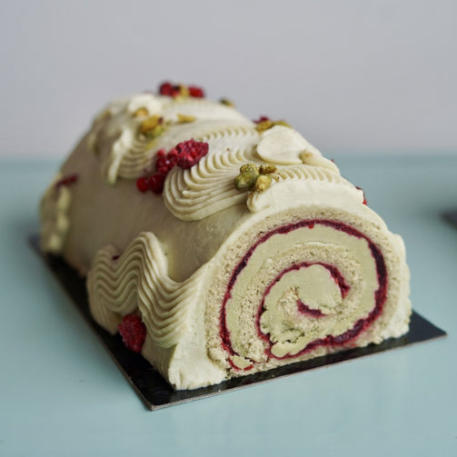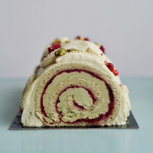 Biscuit roulé pistache, sirop de sapin baumier, crème pistache, compote airelle et framboise