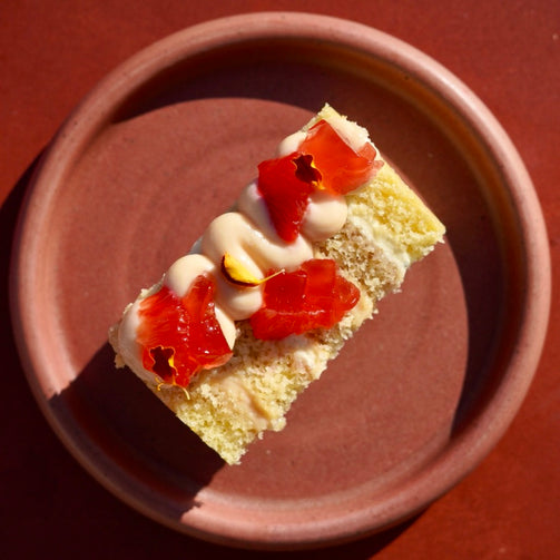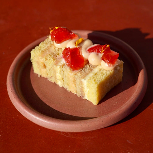Gâteau orange sanguine ricotta: biscuit éponge huile d'olive et citron, crème de ricotta et vanilla, crémeux à l'orange sanguine
